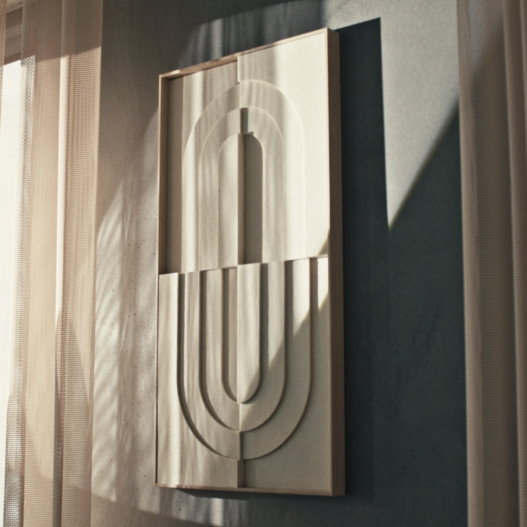 Kvadrat Really creates high-quality circular materials from textile waste; A new engineered materials made from upcycled textiles. The artworks in the collab are created using Textile Felt, which is made from 70% post-production ‘waste’ textile and 30% thermoplastic binder. The design of Arturel x Kvadrat acoustic artworks is our bestseller Arch series made from Kvadrat Really’s Textile Felt. The design is available in 3 sizes: One tile, two tiles and four tiles framed and ready for installation.